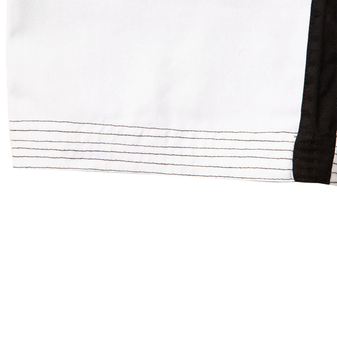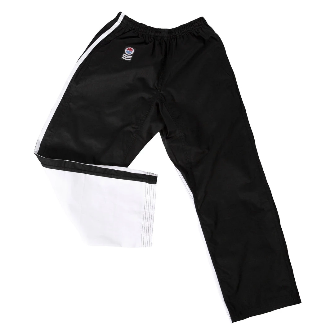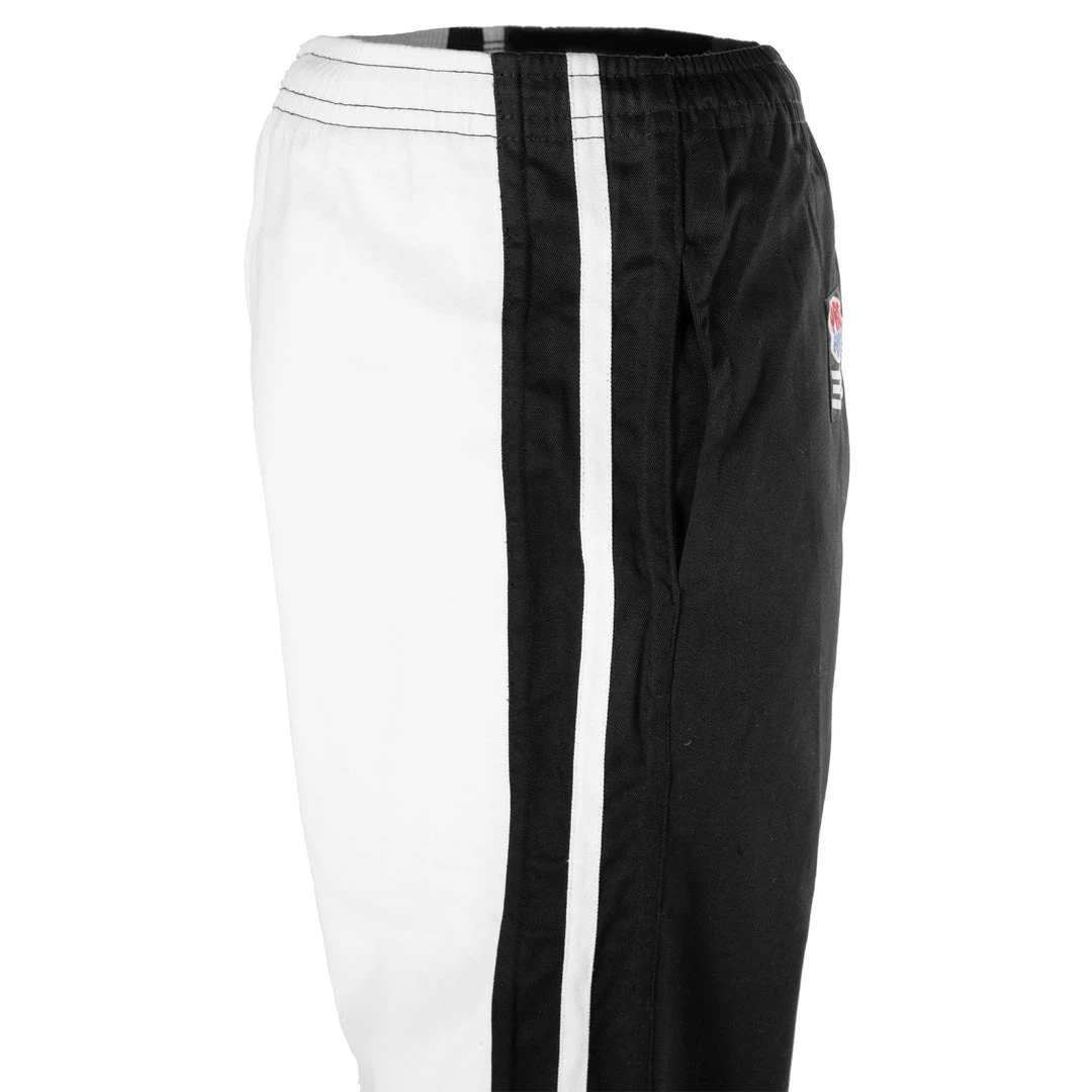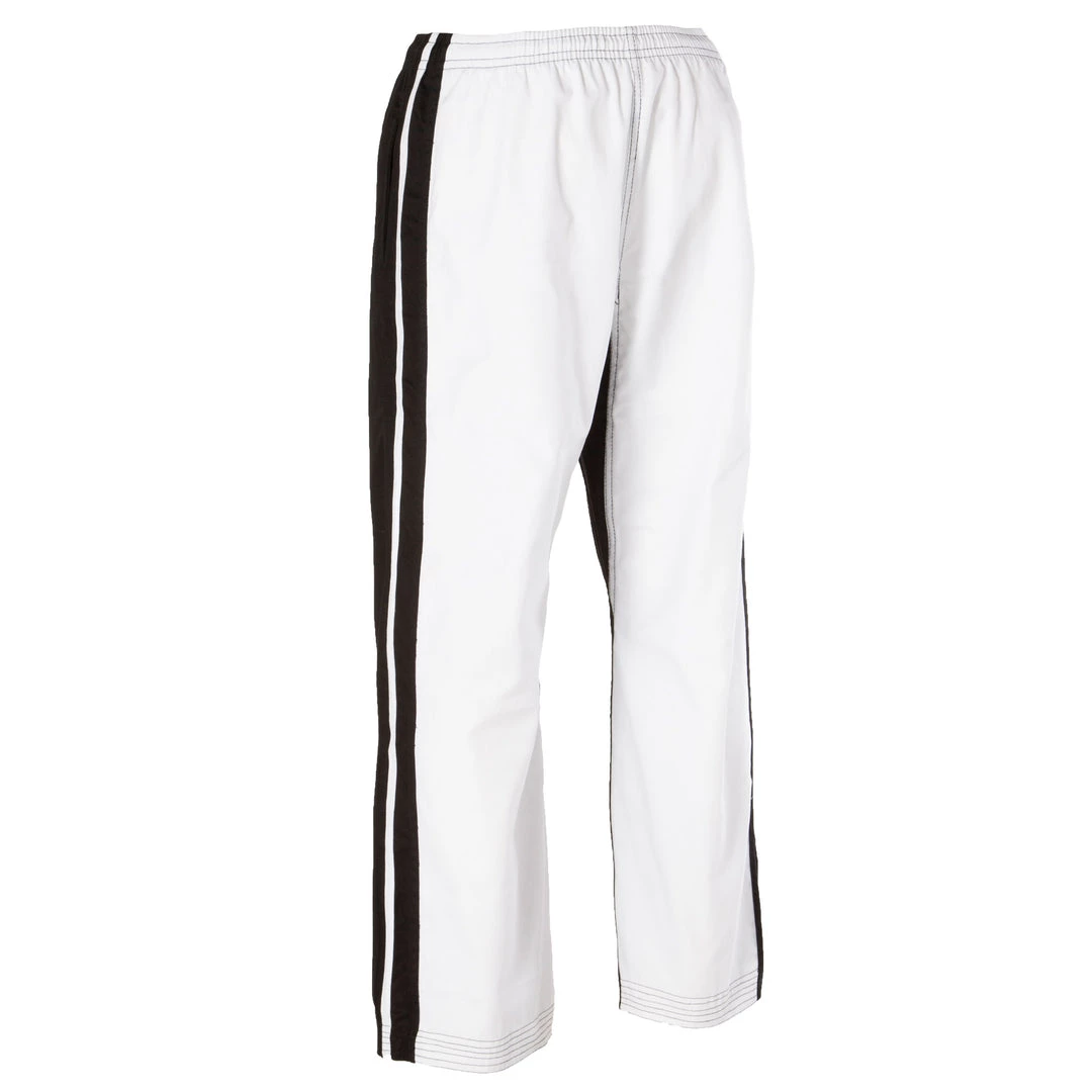 These 8 oz. medium weight karate pants with side pockets are made of a 55% cotton / 45% polyester blend and feature an elastic drawstring waist. Available with Black in the front, White in the back with Black and White stripes down the side, and 4 sizes.