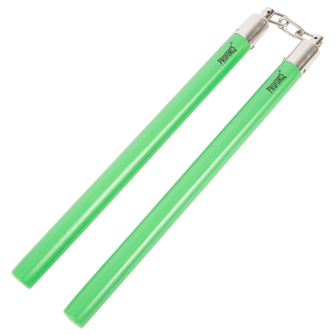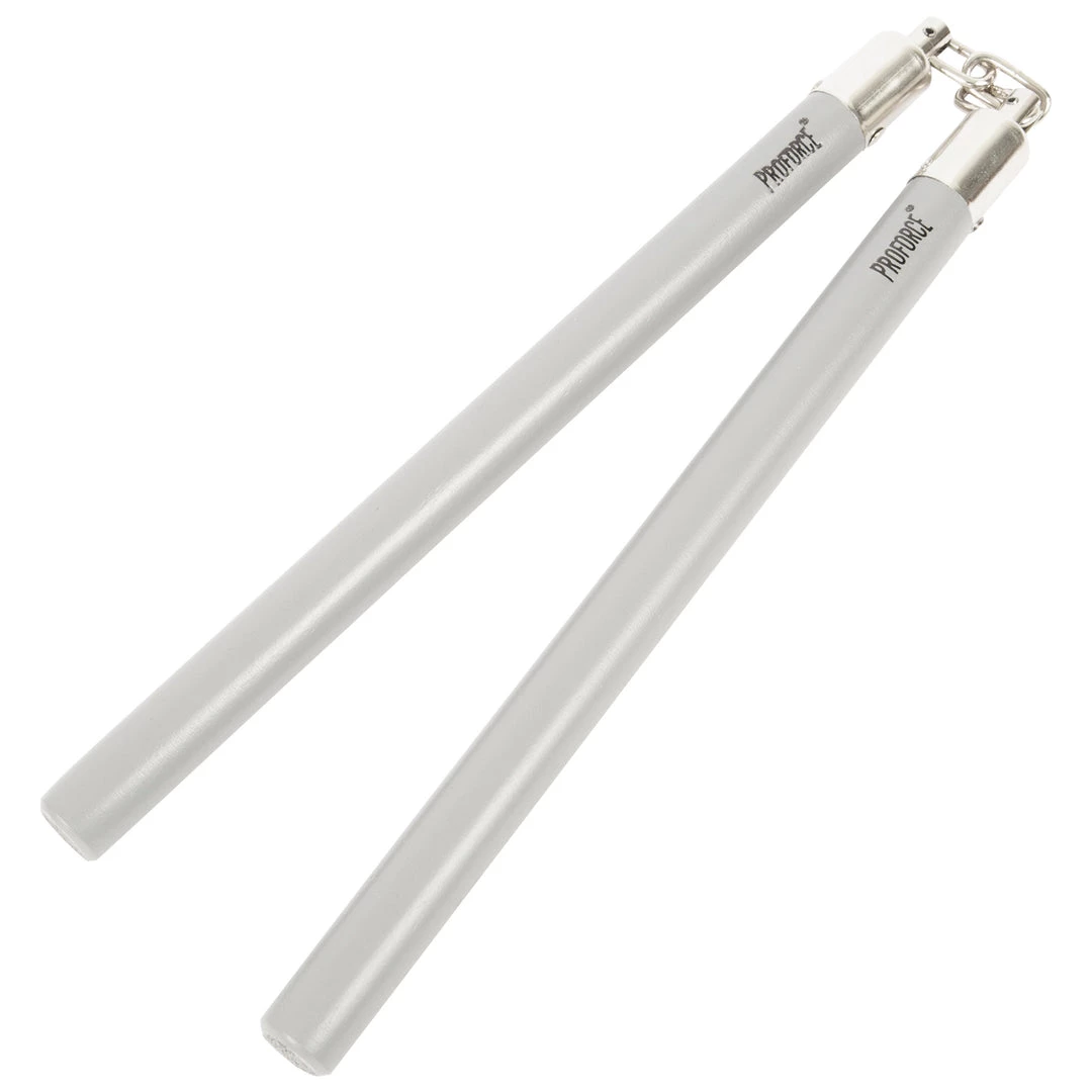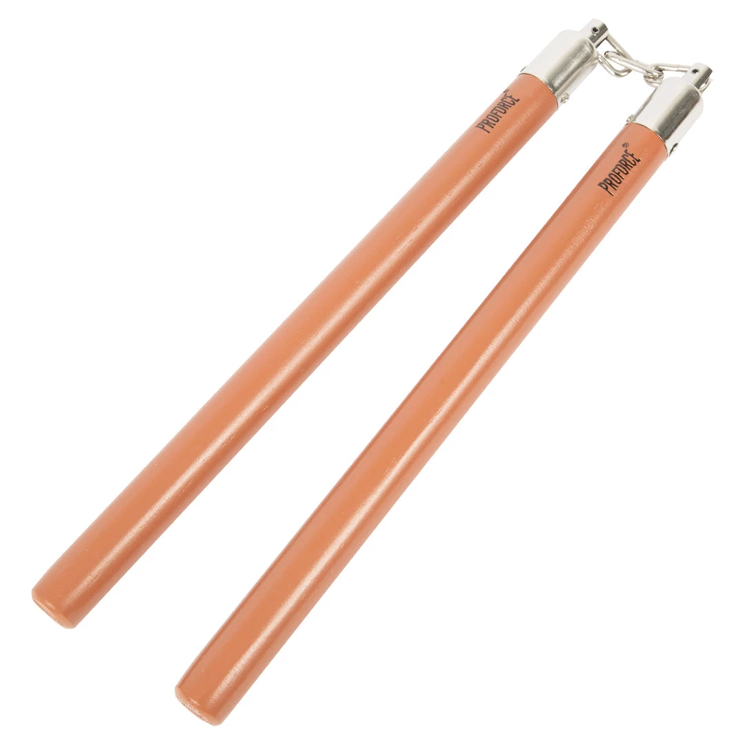 These nunchucks have a 3/4” diameter. 11” long handles and each pair of nunchakus have a 3 link chain.