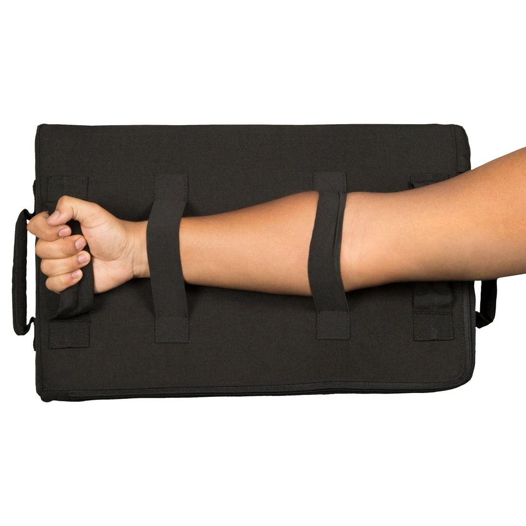 ProForce® Tombstone Shield has multi-angle striking shield to protect against multi striking combinations. It is 20" long x 5.5" thick x 12.5" wide with reinforced cordura nylon cover with Ultra durable foam designed for heavy punch and kick strikes. The Tombstone Shield has Two(2) elastic arm bands centered on the back and Four(4) handles provide a sure-grip every workout and is sold individually.