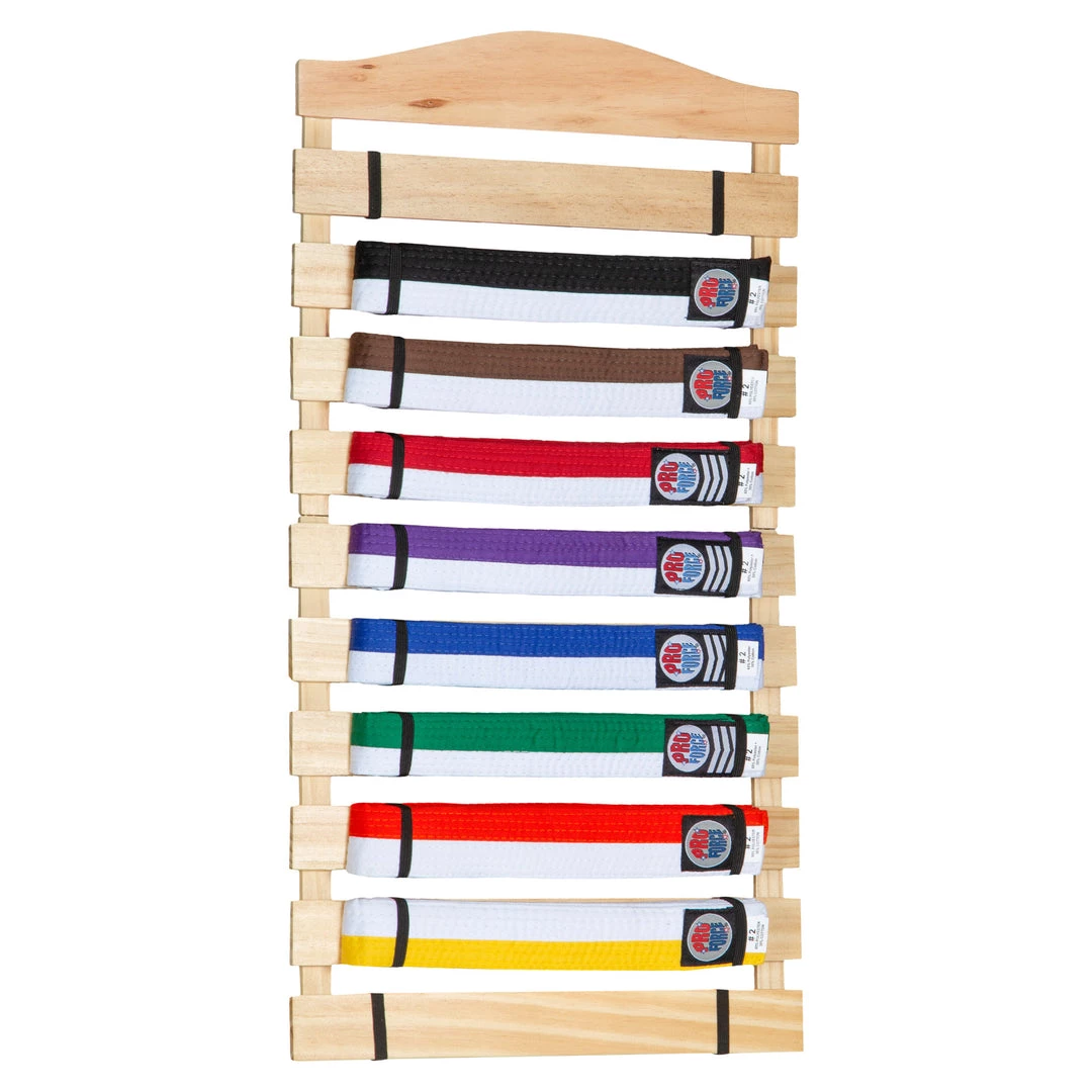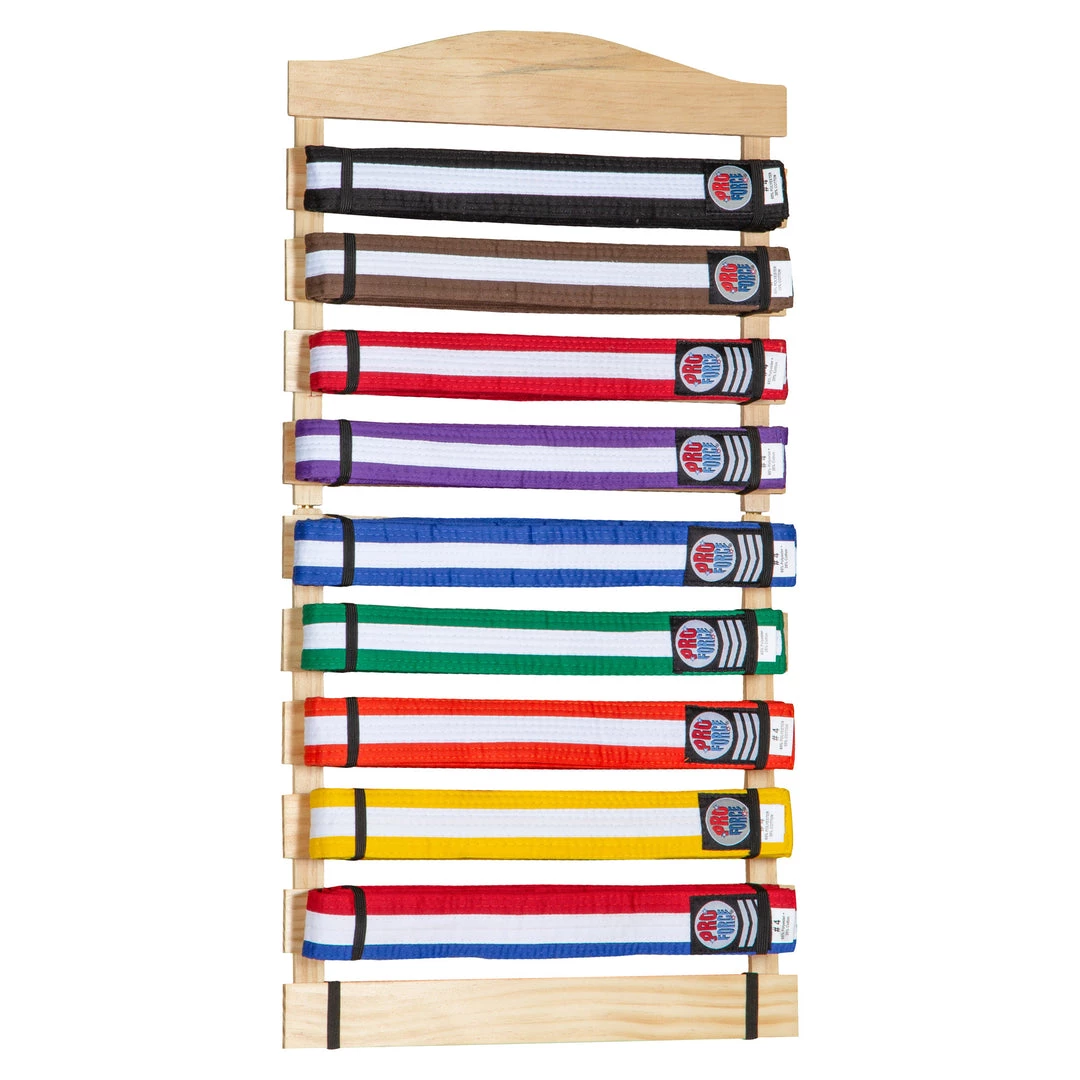 1-7/8" wood slats with elastic straps securely hold 6 or 10 karate belts. Hang loops on back. Belts sold separately.