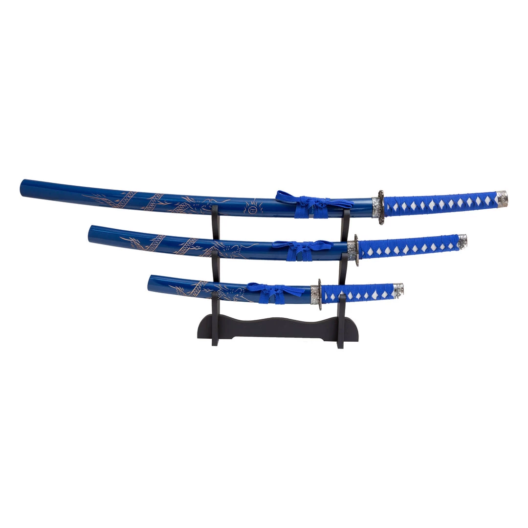 This 3-piece sword set is cobalt blue featuring a carved dragon design on a lacquer-finished scabbard. Ideal for display.