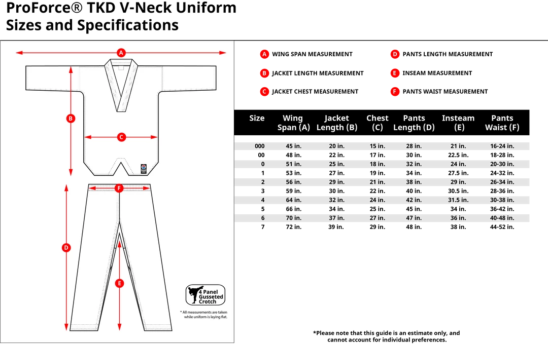 | Size | 000 – Child 8-10, 00 – Child 10-12, 0 – Child 12-14, 1 – 4'9'', 2 – 5'2'', 3 – 5'6'', 4 – 5'11'', 5 – 6'1'', 6 – 6'4'', 7 – 6'8'' |