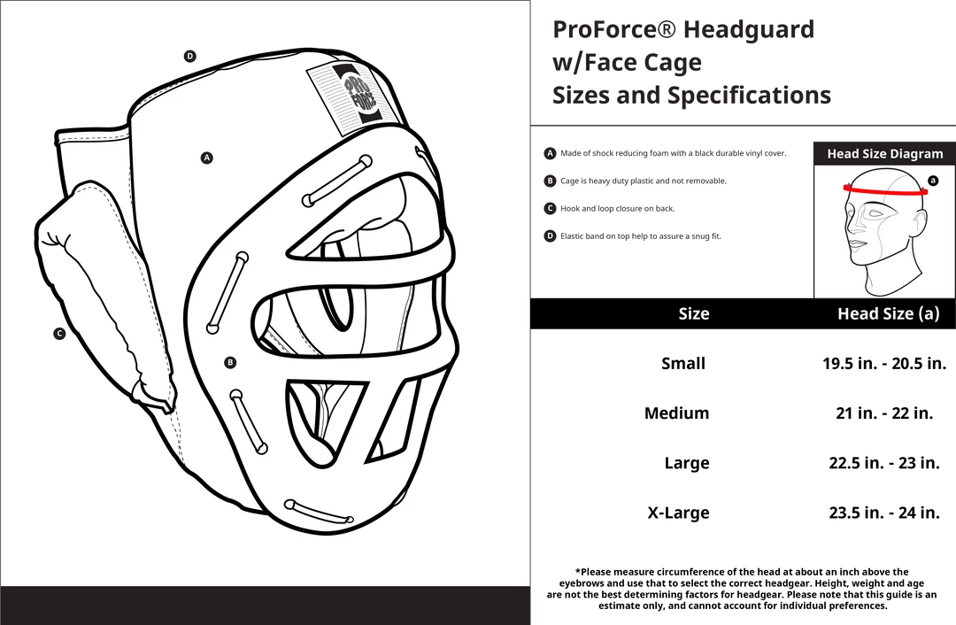 Reduce the risk of a broken nose or black eye with this great headguard from ProForce®. Covering the face is a plastic cage that limits access to the face and helps absorb blows to the rest of the head during sparring. Made of shock-reducing closed-cell foam with a soft vinyl cover. Hook and loop closure on back plus an elastic band on top help to assure a snug fit.
