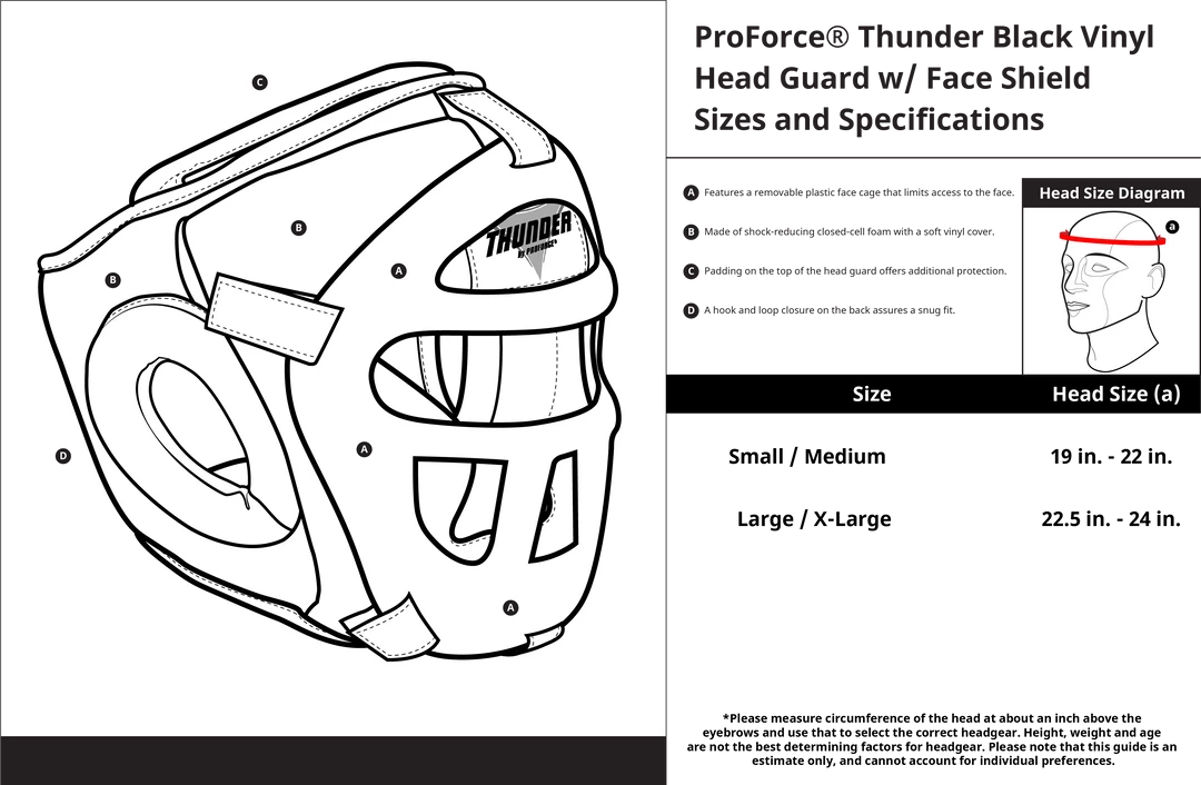 Protect your face in comfort! The ProForce® Thunder Vinyl Head Guard with Face Shield features a removable plastic face cage that limits access to the face and helps absorb blows to the rest of the head during sparring. Made of shock-reducing closed-cell foam with a soft vinyl cover. Padding on the top of the head guard offers additional protection. A hook and loop closure on the back assures a snug fit.