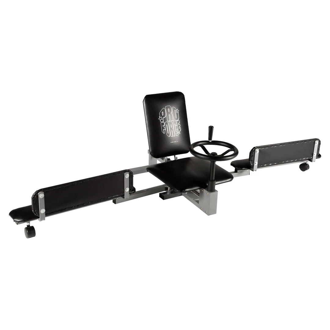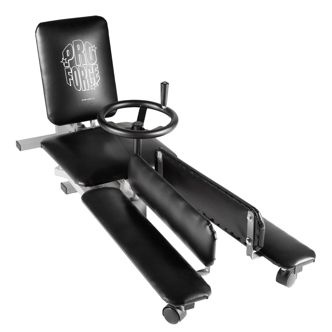 For the ultimate leg stretch you need a super stretcher from ProForce?. Tubular steel construction gives you a sturdy base. Padded back rest and leg extensions give a comfortable workout. Simply turn the gear-driven crank and the leg holders with attached wheels allow you to stretch beyond 180ø. The stop latch enables you to slowly reach and hold your maximum stretch until you are ready to crank yourself back to a normal position. Back rest folds down and the turn wheel is removable for easy storage. Additional shipping charges apply to this item due to its size and/or weight.