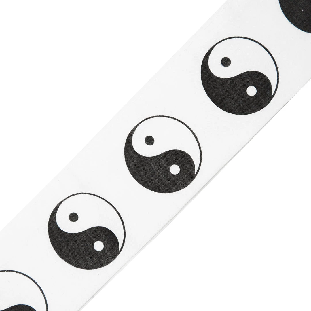 This tie-on headband has a top quality cotton/poly blend. A Yin & Yang repeat pattern that measures 2 1/2” wide x 42” long. It is machine washable and fits kids to adults.
